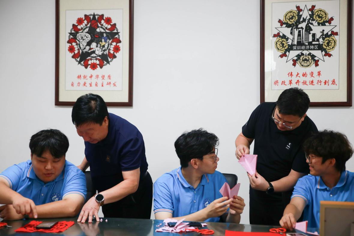 图为团队成员在两代“山花剪纸”非遗传承人的指导下进行体验