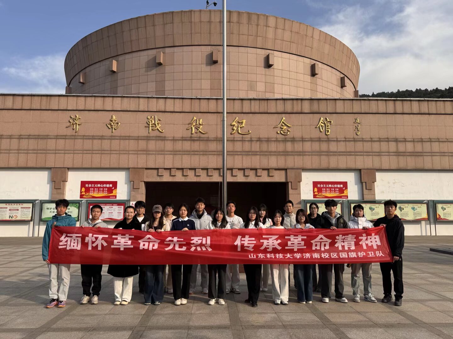 在纪念塔前,队员们整齐列队,向先烈们默哀致敬。随后,队伍走进济南战役纪念馆,开启沉浸式红色学习之旅。在庄严肃穆的济南战役纪念馆,队员们怀着无比崇敬之心,依次参观了“和战博弈 生死较量”“运筹帷幄 剑指济南”“八天八夜 鏖战古城”等八个主题展厅。一件件历经战火的珍贵文物,一幅幅定格历史瞬间的照片,一段段详实的史料记载,生动再现了济南战役的壮阔场景和革命先辈们不畏艰难、勇于牺牲的崇高精神。