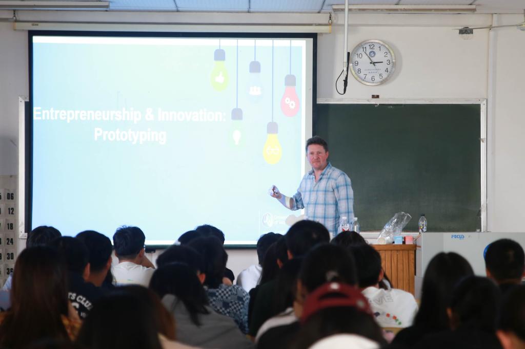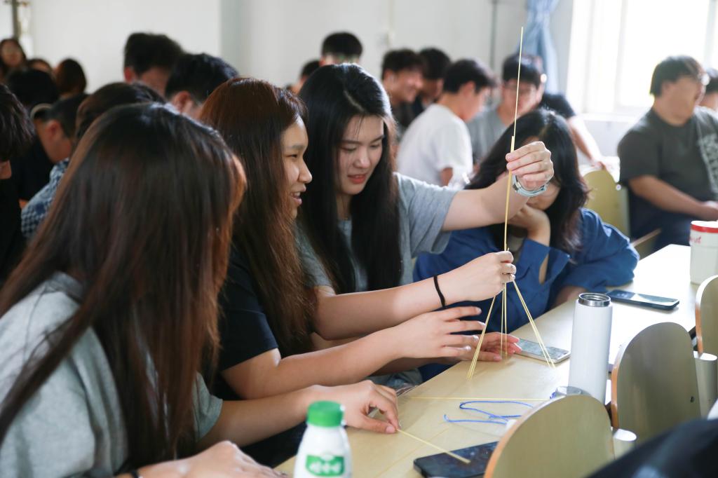 教授将“棉花糖挑战”搬进课堂,组织现场同学利用意大利面、胶带和棉花糖进行搭建。从最初的设计构思到实际搭建,再到反复拆解重构,棉花糖挑战见证了思维碰撞与迭代优化的全过程。此起彼伏的讨论与成功搭建后的欢呼,充分彰显出浓厚的学术实践氛围与团队凝聚力。随后,Robin Bell教授借助TED演讲再次强调了原型迭代对于新产品设计的重要性。