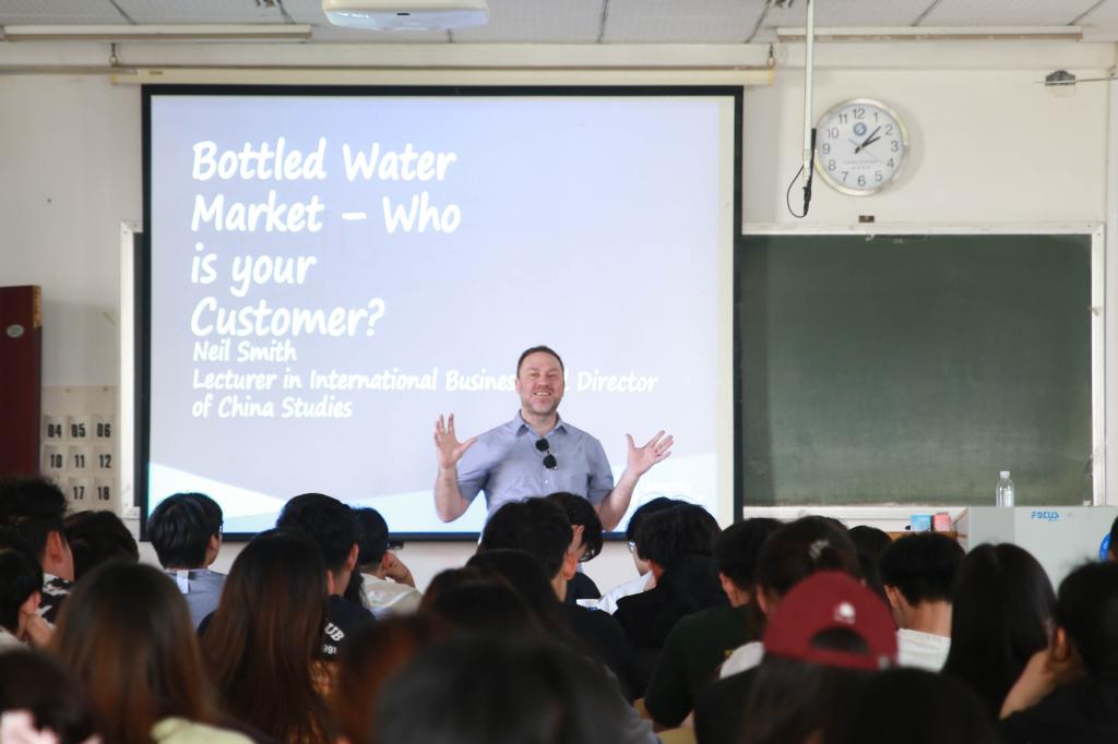互动环节,Neil Smith以沉浸式课堂解锁商业奥秘。以“水”为媒演绎同质产品竞争策略。他将三款不同品牌、价位的水呈现在课堂,邀请同学们通过观察以及品尝口感差异,对三款水进行价格排序。同学们踊跃参与,现场气氛持续高涨。老师采用“理论+实践”双轨教学模式,通过具象化的案例拆解,让晦涩的理论知识直观展现,生动诠释了消费者决策背后的深层逻辑。