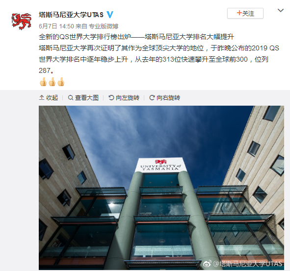 近日,从网络媒体获悉2019年QS世界大全综合排名出炉。与我校开展中外合作办学项目的澳大利亚塔斯马尼亚大学跃居全球第287位,比去年上升了26位,这让塔斯马尼亚大学成为全球前300强的大学。塔斯马尼亚大学的QS排名已经持续多年上升,2017年比2016年上升9位,2018年比2017年上升57位。