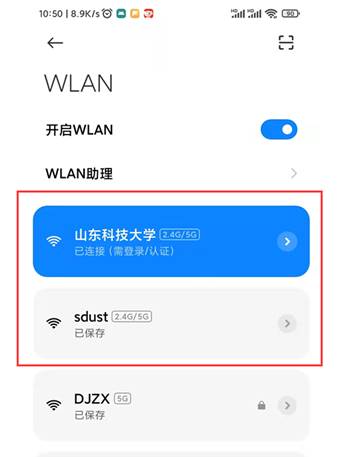 1.打开移动设备WiFi功能,搜寻无线网络:首先在自备移动终端设备(如手机、笔记本等)查找名称为“山东科技大学”或“sdust”的校区无线网并点击连接