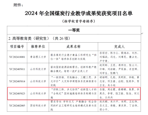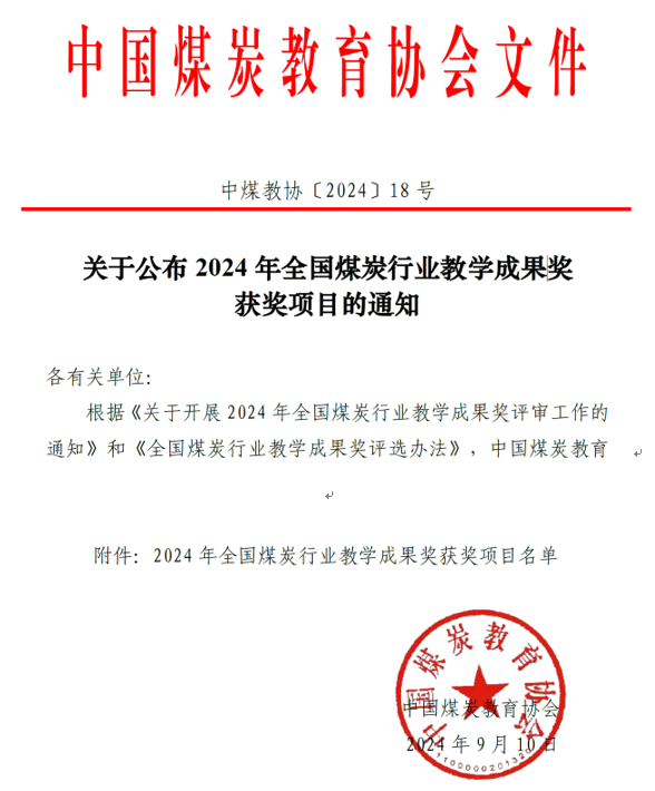 近日,在2024年全国煤炭行业教学成果奖评审工作中,yl23455永利金融系吕强老师的教学成果《“四联三跨、多元协同”创新型人才的“全栈式”因材施教培养体系构建与实施》获全国煤炭行业教学成果奖高等教育类(研究生)一等奖,该奖项全国仅评出26项。