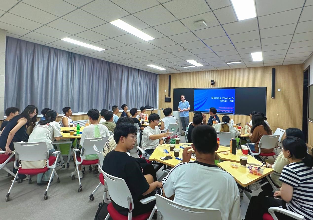 2024年9月20日,澳教团队第二期英语角活动在智慧教室如期举行。该活动以“沟通与技巧”(Meeting people & Small talk) 为主题,吸引很多大一新生前来参加。主讲人Samuel围绕 “沟通、交友”,从寒暄技巧展开,为同学们提供一个畅谈口语的机会,让他们能够在轻松愉悦的氛围中提升自己的英语表达能力,练习了正式与非正式场合中的沟通技巧。
