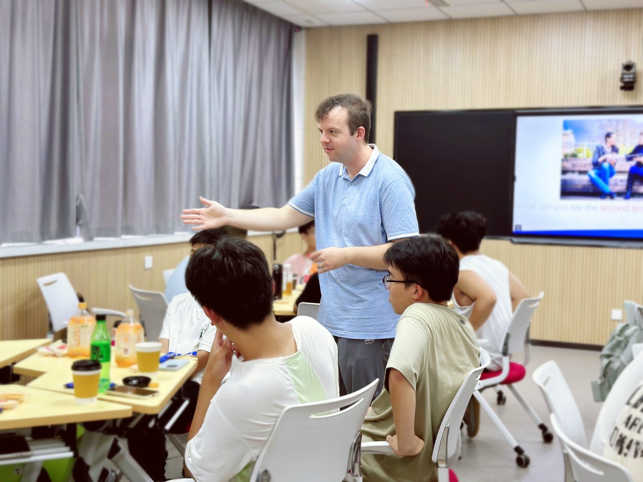 活动开始时,外教Samuel带领同学们讨论如何向别人问好,然后又带着同学们一步一步从从简单的寒暄自然过渡到更深入的交流。他通过生动的实例帮助学生理解日常对话中正式和非正式表达的差异,指导他们如何在不同的场景中使用恰当的沟通方式,同学们积极参与,勇敢表达,迅速投入到课堂互动中。