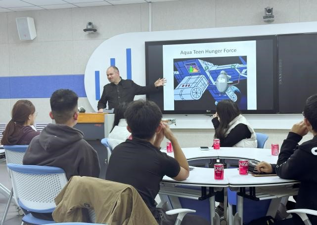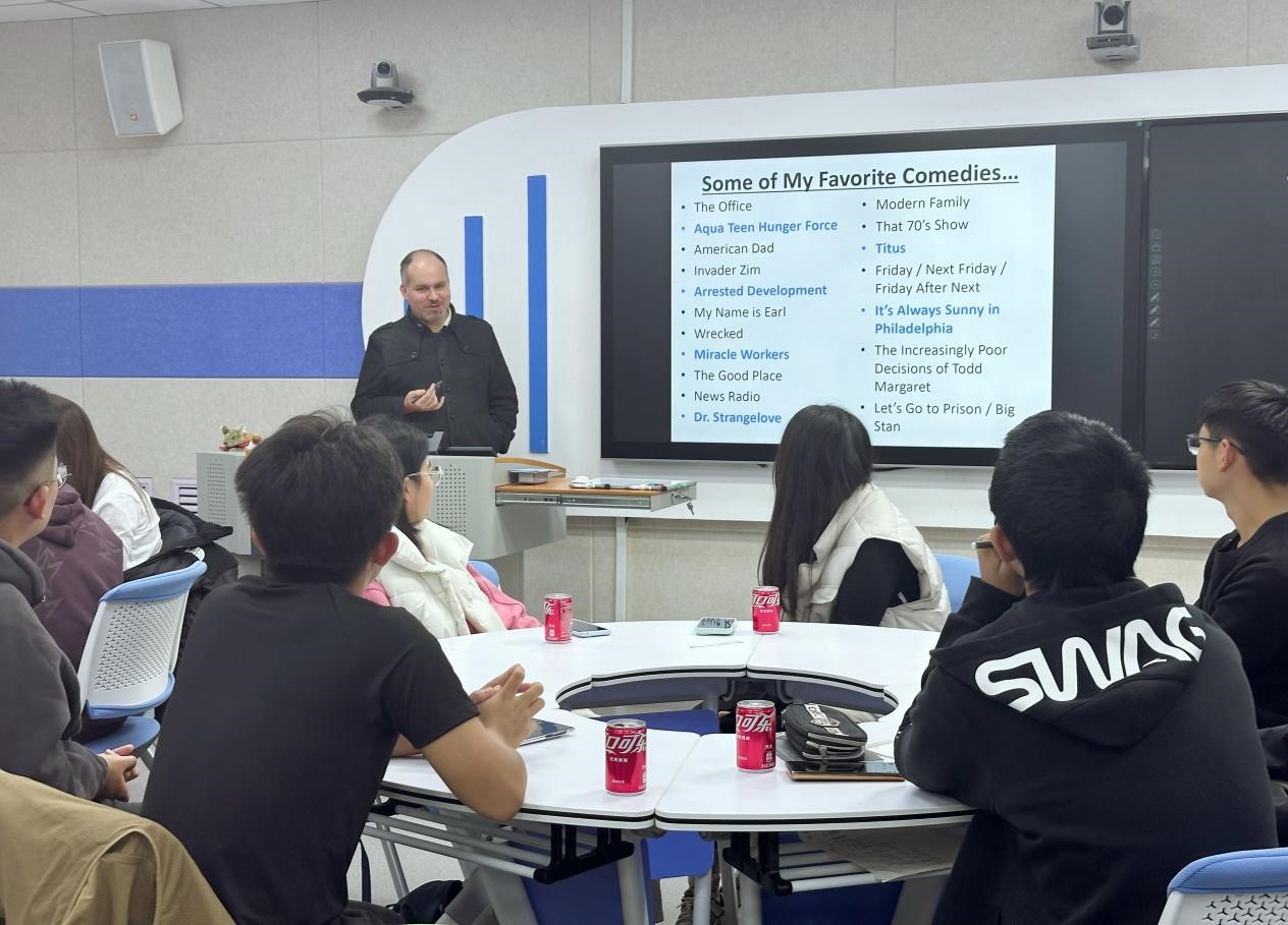 2024年10月29日,第五期英语角活动再次拉开帷幕,由外教Matthew主讲,以“喜剧与幽默感”(Comedy and Sense of Humor )为主题展开了一场围绕美式幽默和美国文化的活动。Matthew通过展示国外流行的情景喜剧片段,带领学生感受美式幽默的独特魅力。他不仅介绍了美剧的语言风格,还深入讲解了美式幽默背后的文化背景和生活元素,帮助学生们理解这种幽默感的来源和表现方式。