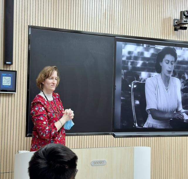 外教Mary在活动开始介绍不同英语口音的规则,并重点讲解英式口音的特点。通过对英女王伊丽莎白和丘吉尔等讲话名场面视频进行讲解,让学生领略了不同口音之美。她生动的讲述和专业的指导,引导学生逐步分析典型的英式发音方法,特别是在元音和辅音的发音方式上做了细致的讲解。