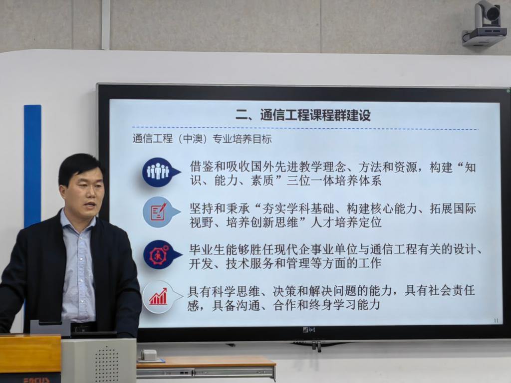 杨金梁首先从课程思政时代背景切入,讲述了通信工程(中澳)专业发展历史、培养目标、核心课程体系建设以及课程思政建设模式;提出了以学生为中心,构建知识-能力-素质三位一体的人才培养目标思路;系统讲述了通信工程(中澳)专业核心课程群的课程思政实施举措和思政特色。最后,他还介绍了通信工程专业核心课程群课程思政的改革成效和创新点。
