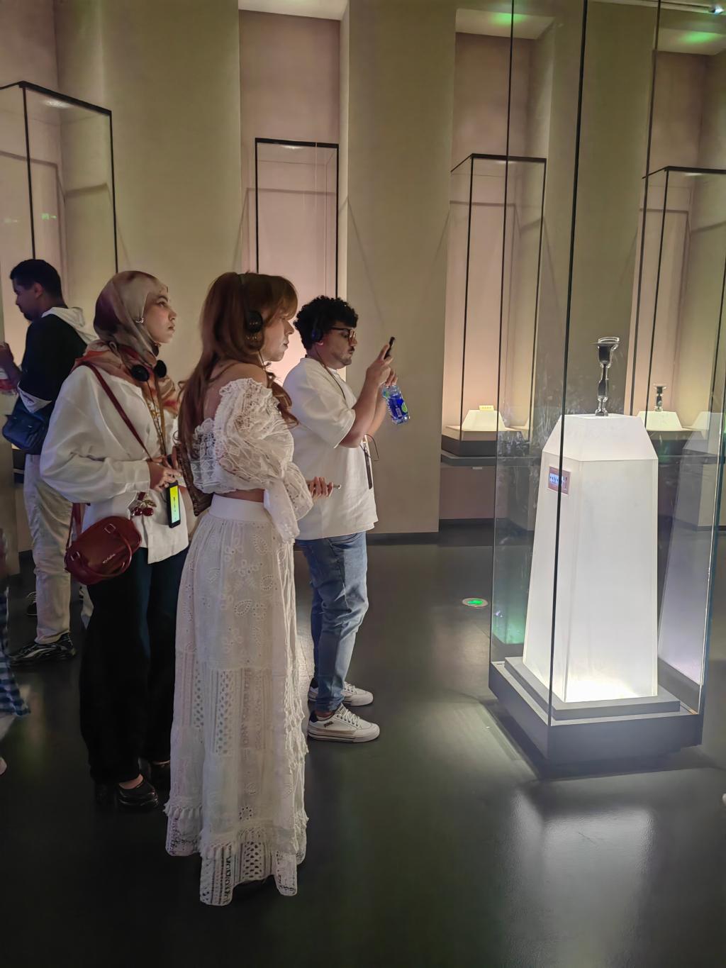 留学生们沿历史发展脉络依次参观展厅,被史前黑陶、青铜重器与鲁国玉璧深深吸引。蛋壳黑陶高柄杯的极薄工艺引发惊叹,亚醜钺的独特造型与颂簋的繁复纹饰充分展示了四千年前的“工匠精神”,纷纷成为了留学生们的拍照焦点。