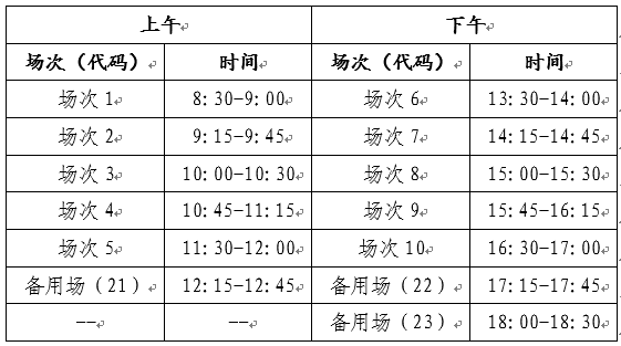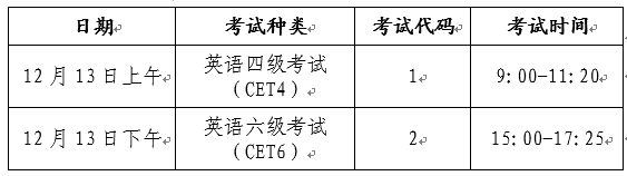 英语四级口语考试(CET-SET4)考试时间为11月22日,英语六级口语考试(CET-SET6)考试时间为11月23日,具体场次安排如下: