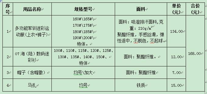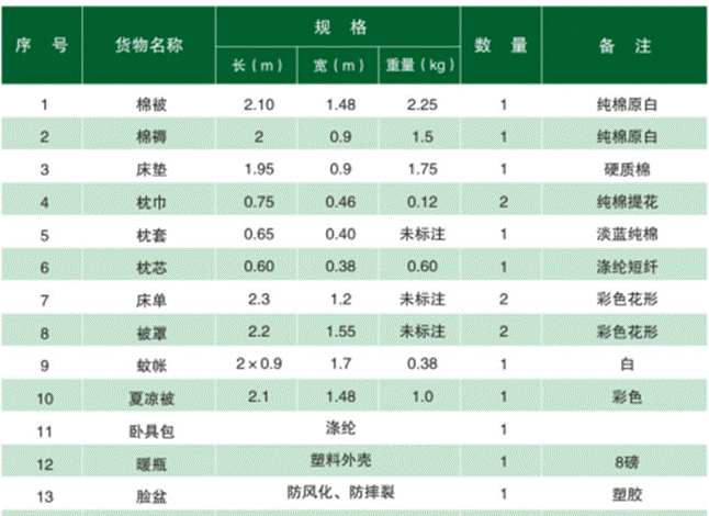 2、军训用品费:每生实际应收168元(暂收170元,应退2元),学校统一招标采购,按成本收取。包括以下内容:
