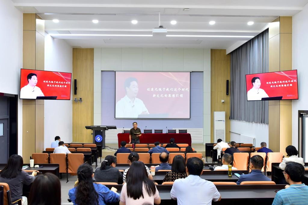 为深入学习贯彻习近平新时代中国特色社会主义思想,贯彻落实党的二十大精神,9月25日,机关党总支在109报告厅组织全体教职工集中收看学习习近平文化思想大讲堂第一讲“创造无愧于我们这个时代新文化的思想引领”,机关党总支书记仉兴泉主持,全体教职工参加学习。