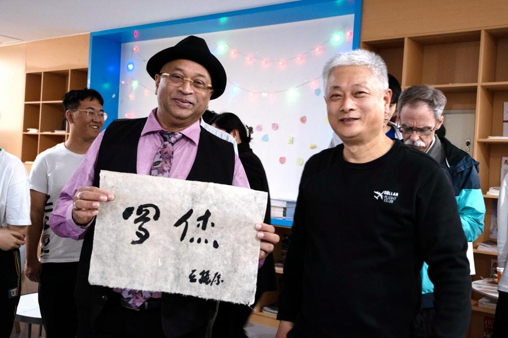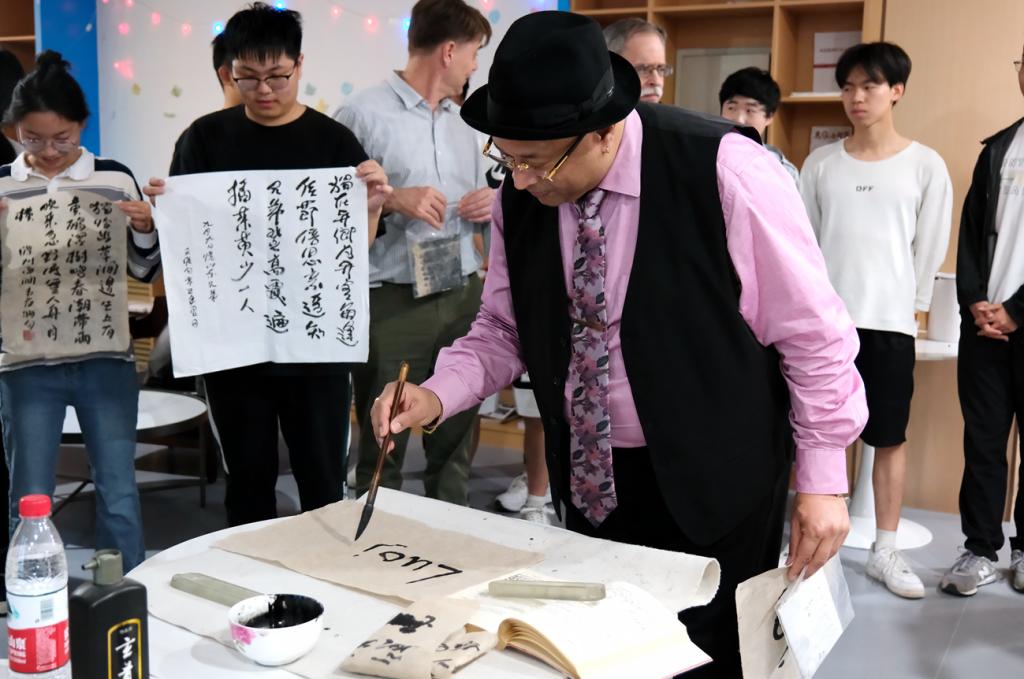 活动现场,师生共同习书法,临写颜真卿、柳公权书法作品,为外教书写中文名字,赠送画作,外籍教师沉浸式感受中国书法的魅力。