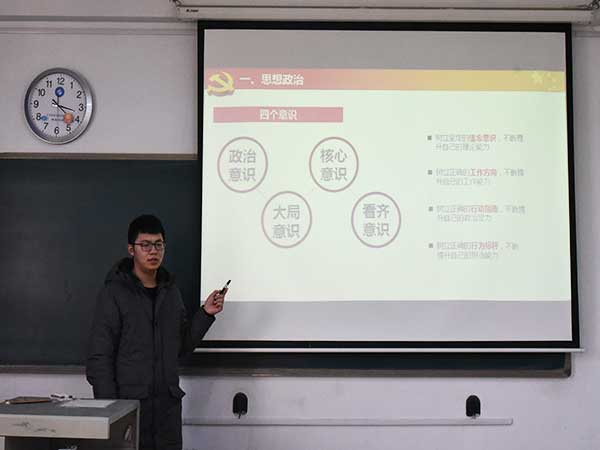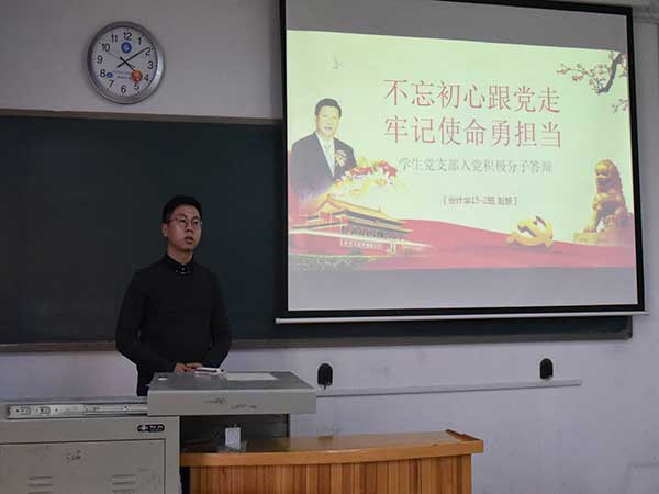 为增强和激发组织活力,有效发挥基层党组织的战斗堡垒作用和支部党员的先锋模范作用,引导青年学生进一步增强“四个意识”,根据《中共山东科技大学委员会关于做好发展党员工作的意见》(校党字【2015】59号)要求,结合支部学生党员流动性强的特点,财经系学生党支部制定了《财经系学生党支部入党积极分子过程化培养考察实施细则》和《财经系学生党支部入党积极分子过程化培养考察信息汇总表》,将先锋模范作用发挥的辐射范围扩大到入党积极分子。11月21日下午,财经系学生党支部于分别在1-502、504、506、508教室组织了以“不忘初心跟党走,牢记使命勇担当”为主题的入党积极分子答辩会。财经系团总支书记袁玉磊,财经系学生党支部书记齐斯文、宣传委员王小杰、组织委员张绍琦及财经系全体学生党员担任评委,70余名入党积极分子参加本次答辩。
