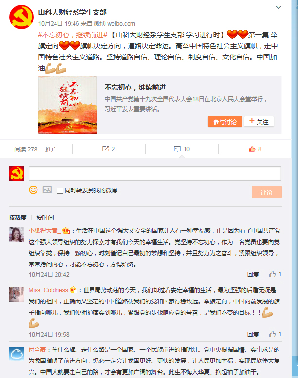 本次学习内容主要观看了《不忘初心 继续前进》第一集举旗定向。该片围绕以习近平同志为核心的党中央五年来治国理政的伟大实践,展现了推动中国发展的决策理念,分析了重要顶层设计酝酿提出的时代背景和深刻内涵,展现了近五年中国经济发展所取得的催人奋进的光辉成就,描绘了在新的历史起点,党中央如何谋篇布局、攻坚克难、强基固本,稳步推进中国特色社会主义制度的巩固。大家认真观看,学习了中国在过去五年发生的历史性变革和历史性成就的根本原因。会后,支部学生党员和入党积极分子踊跃在支部微博中进行了线上讨论学习。