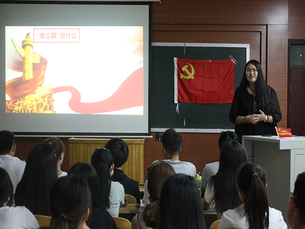 首先,王晓琼围绕《为人民服务》、《愚公移山》和《纪念白求恩》等毛泽东经典“老三篇”文章展开讲解。她着重讲解了为人民服务这一精神宗旨,并强调“为人民服务”是适应时代要求而产生的一种新的道德思想。随后,她从八路军战士张思德、2012年感动中国十大人物陈家顺和“5.12”地震中做出无私奉献的王洪发等人的英勇事迹入手,向大家展现出一代代共产党人不畏艰险,勇于担当的革命精神。徐洁以“悟红歌之魂,忆党路建设”为主题,带领大家欣赏了红歌《让我们荡起双桨》和《大中国》等歌曲,并为大家讲述了其背后的故事及社会意义,使同学们感受到红色歌曲中蕴含的强大精神力量,增强了大家的民族自信心和自豪感。最后,冷思敏为大家讲述了中国人民解放军开国之将孔庆德的光辉事迹,并播放了电视剧《人民的名义》节选片段,宣讲在热烈的气氛中结束。