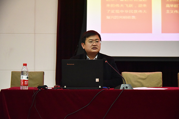 胡宝征从新时代中国特色社会主义思想入手,通过对比党的八大、十一届六中全会以及十九大报告中分别对我国社会主要矛盾的判断,指出社会主要矛盾的转化是进入新时代的基本依据。他结合党的十八大以来党和国家事业取得的历史性成就,阐述了五年来党和国家事业发生的历史性变革,鼓舞和激励青年大学生坚定四个自信,继续把党和国家事业推向前进。十九大报告中指出,这是一个承前启后、继往开来的新时代,是我国日益走近世界舞台中央、不断为人类做出贡献的时代。他勉励青年大学生树立与这个时代主题同心同向的理想信念,勇于担当时代赋予的历史责任,激发最强劲的奋斗力量,绽放最美的青春光芒。