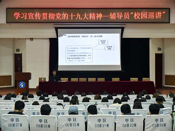 为紧跟新时代步伐,领悟新时代思想,激励大学生努力奋斗,创造美好未来,12月21日与12月25日晚,yl23455永利于图书馆报告厅举办学习宣传贯彻十九大精神“辅导员巡讲”报告会,优秀辅导员宣讲团成员、财经系党总支副书记胡宝征作了题为《奋力开创新时代中国特色社会主义美好未来》的报告,财经系2015级、2017级全体学生聆听了报告。