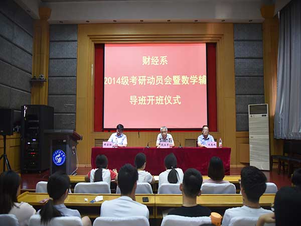9月20日,由财经系举办的考研动员会暨数学辅导班开班仪式在1-109报告厅举行。财经系主任段治平、系党总支副书记兼副主任胡宝征、系副主任刘忠诚及系团总支书记袁玉磊出席本次大会,2014级、2015级有考研意向的同学们参加了此次会议。