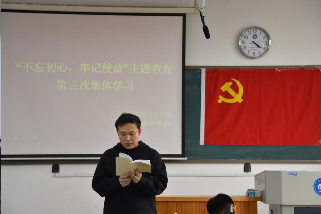 首先,学生党员代表马晨钧、张穗雨带领在座学生党员学习《习近平关于“不忘初心,牢记使命”论述摘篇》第七至十篇。本次学习重点强调了中国共产党勇于自我改革,坚决整治形式主义、官僚主义,加强真抓实干的作风建设,同时也向全体党员提出加强学习,深入开展调查研究,在新时代做出新作为的希望。