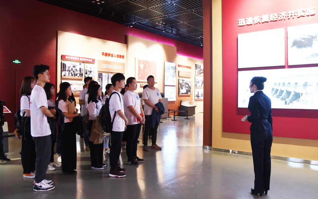 参观伊始,全体学生党员于博物馆主题展览前厅合影,随后由讲解员带队进行系统参观。通过讲解和观看,学生党员们领略了从1949年到1978年百废俱兴、艰苦创业的历史,了解了山东大地1978年到2012年勇立潮头、砥砺前行的风貌,也感受了2012年至今走在前列、全面开创的盛况。一张张图片、一段段文字不仅展现了齐鲁大地博大精深的改革画卷,也串联成党领导下方方面面创新发展的宏伟蓝图。无论是从农业、工业、科教文卫各项事业,还是从农村改革、乡镇突起到城市改革、企业改革、重大项目建设,亦是从政治建设、思想解放、对外开放、精神文明、生态文明建设,无不彰显着齐鲁大地改天换地焕新生、勇立潮头敢为先的独特魅力。