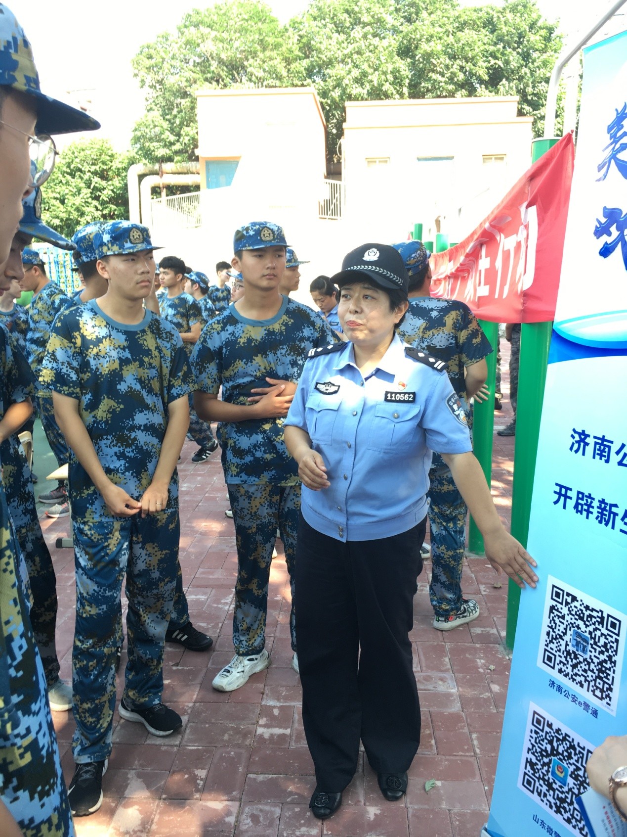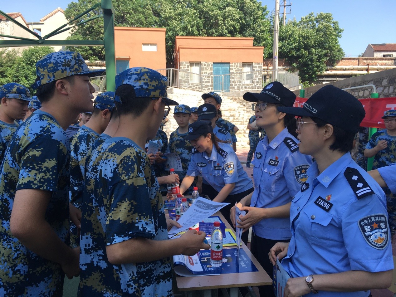 2021新生利用军训休息时间积极踊跃参加宣讲活动。活动现场,干警们为新生详细讲解了济南市落户政策,回答了学生提出的相关问题,同时进行了反电信网络诈骗、反邪教等的宣传教育,发放了印制精美、趣味性强的反诈传单和小物品,为学生们上了生动的一课。
