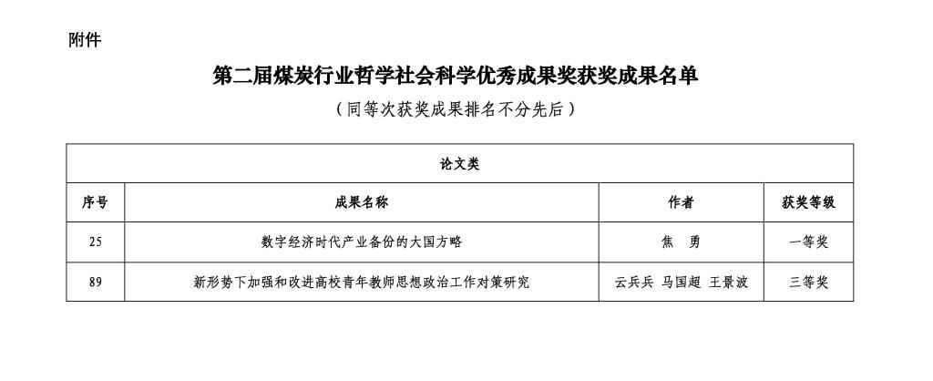 近日,中国煤炭教育协会公布了第二届煤炭行业哲学社会科学优秀成果奖获奖名单,校区教师焦勇、云兵兵的研究成果获奖。其中,焦勇的《数字经济时代产业备份的大国方略》获得论文类一等奖,云兵兵、马国超、王景波的《新形势下加强和改进高校青年教师思想政治工作对策研究》获得论文类三等奖。