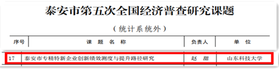 近日,校区赵甜团队的《泰安市专精特新企业创新绩效测度与提升路径研究》成功立项泰安市第五次全国经济普查课题。